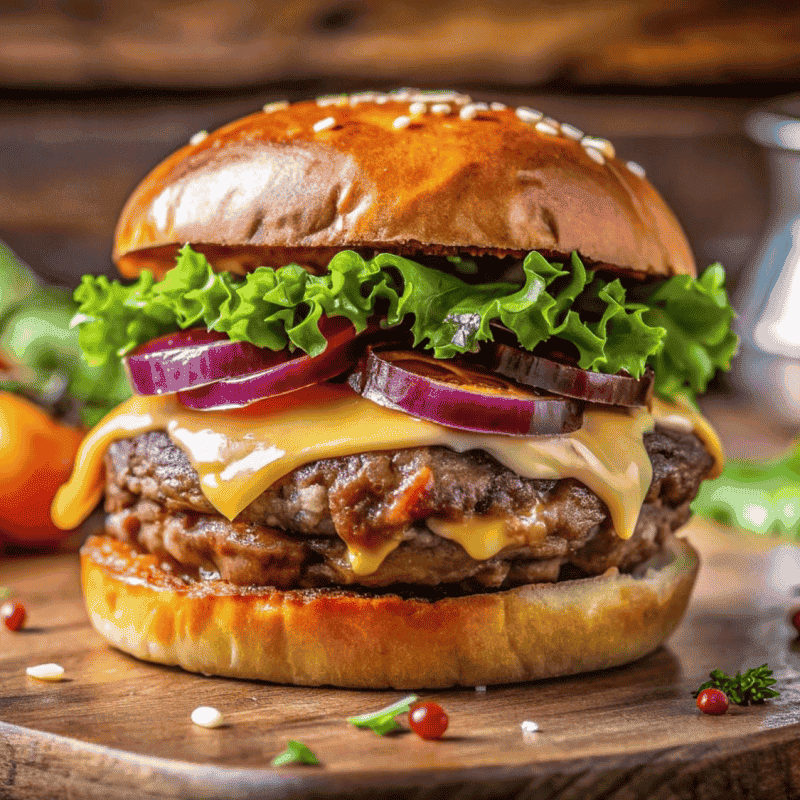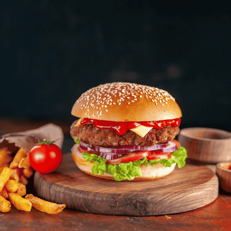 Sink your teeth into the ultimate indulgence with our juicy cheeseburger. Made with a perfectly seasoned, tender beef patty, topped with melted cheese and fresh, crisp vegetables, this burger is a flavorful masterpiece that’s sure to satisfy your hunger.