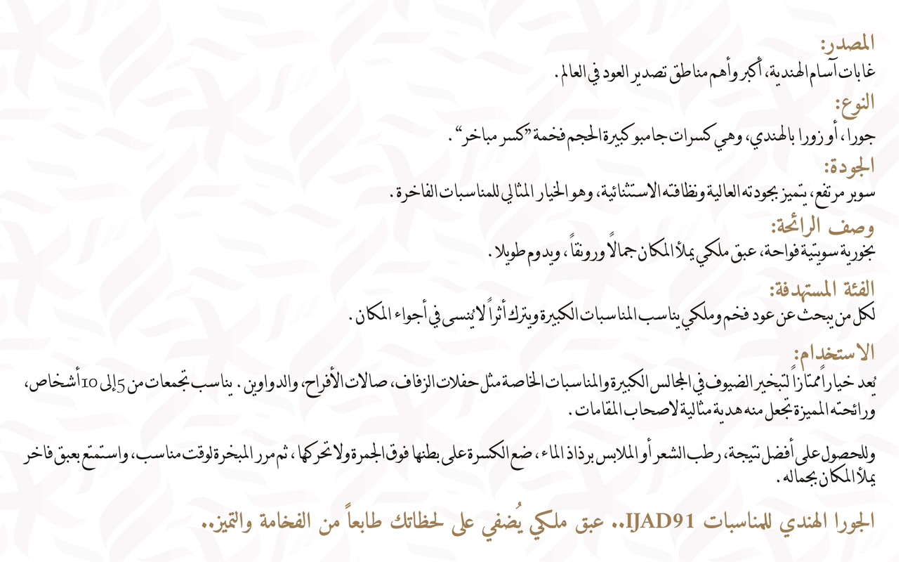 الفئة المستهدفة: لكل رجل وامرأة يبحثان عن عود فخم وملكي يناسب المناسبات الكبيرة ويترك أثراً لا يُنسى في أجواء المكان