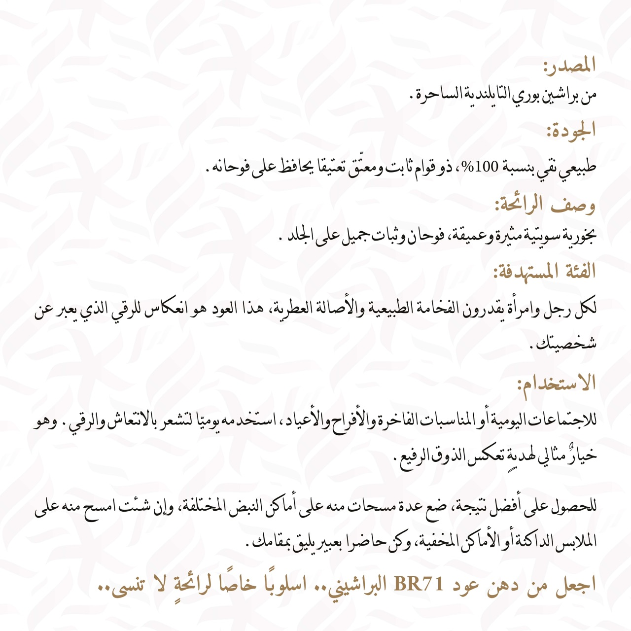 مُستخرج من أشجار العود في غابات سلطنة بروناي، وهو أحد أندر وأفخم أنواع دهن العود، يتميز بندرته وتوفره بكميات قليلة..